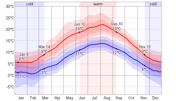 V zimě zde málokdy teplota klesne pod bod mrazu na delší časové období, přesto se tak občas stane. V průměru téměř na 60 dní v roce spadne teplota k bodu mrazu. Nejnižší průměrná teplota od prosince do února je 1 °C, nejvyšší průměrná 6 °C. V lednu je zde nejméně slunečního svitu z celého roku, v průměru 1 hodina denně. Srážky jsou mírnější a kratší než na podzim, jejich frekvence však zůstává stejná.